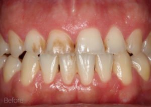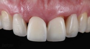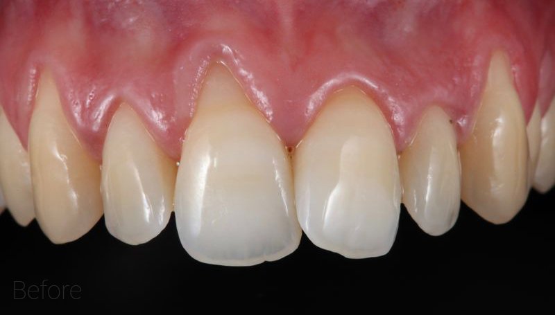 After decontaminating the area (deep scaling and root planing) we decided to perform a crown lengthening procedure of the anterior teeth. After 3 months of healing the rehabilitation with crowns was started.